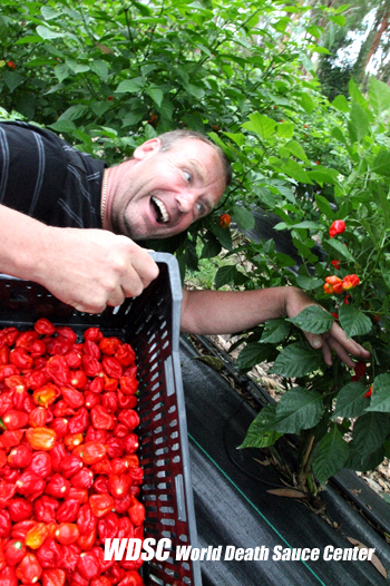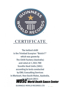 ■Alex■ Never thought or expected it to be that hot!! We knew the Scorpion Chillies were hot and got them tested to see how hot out of curiosity. When we had the hottest chilli in the world we were beside ourselves and went crazy…. had a few beers and thought OK whits next? Let’s send in all the paperwork to Guinness World Record in London to see if we can go for the Guinness World record!! We never expected it and never dreamt about it but were certainly pleasantly surprised by the outcome of the testing and after that did not realised what hit us!! Interviews all over the world for radio stations, Television and newspapers and magazines…. made us famous without realising we would be… ENJOYING every minute of it and we still love what we are doing!! Never did it to be famous but do love all the attention it has given us…. We are hard workers and work 7 days a week for many hours a day to get the job done. So in between all the hard work do enjoy to sit down and look at the Guinness world record and be proud of ourselves. ■アレックス■ まさに「有頂天」だったね!嬉しすぎて頭を振りながら叫んでいたよ!でもまさか、ここまで辛くなるとは思わなかったね! 「スコーピオン・チリ」がとにかく辛いって事は、僕らは知っていたけど、実際本気で食べたらどんな事になるのか、試食してみたんだ。 世界一辛い唐辛子を口にして、僕らはオカシクなっちゃったね。ビールを流し込んで落ち着いて、「どうしよう、これ?」って。それからこの唐辛子がロンドンのギネスに申請できるか どうか、書類を急いで手に入れたんだ。 今の状況を、僕らは全く予想していなかったし、夢にも見ていなかった。素直にテスト結果に驚いていたけれど、ギネス認定後、こんな事になろうとは思っていなかった! 世界中のラジオ局、テレビ局、新聞や雑誌からのインタビューが、実感する間もなく僕らを有名にしてしまった・・・。 今でも僕らは一分一秒を楽しんでいるし、やっている事も大好きだよ!全ては「有名になりたくてやった」わけじゃなくて、研究に払った注意深さ(過程)に意味があったんだよね・・・。 僕らは仕事をこなすために、一週間毎日ハードに働いている。その激務を楽しみつつ、ふとした合間、チェアに座って「ギネス認定書」を眺めては、自分達の誇りを再認識するんだ。