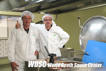 ■Alex■ Yes well we like sauces and pastes and condiments that keep us extremely busy with work and trying to keep up with the ever-growing demand for our chilli range! We might want to add a chilli powder in the future but for now we keep our range as it is. Because we already had two pastes (turbo Supercharge extremely hot habanero paste and the Devil’s Delirium Hot Jolokia paste) we decided for the new Guinness World Record Sauce Scorpion Strike we will make a sauce so we have something different. But you can use the Scorpion Strike the same way as you use the hot pastes and add to cooking and stir fries you do not have to use it as a sauce there are no rules concerning our chilli range and be free to experiment with it!! ■アレックス■ うん、確かにそうだよね、僕らは唐辛子への情熱を刺激して止まず、仕事も忙しくしてくれる「チリソース」も、「ペースト」も、粉系の香辛料も全部大好きだよ。 僕たちは「唐辛子のパウダー」を将来的にはラインナップに加えるかも知れない。でも、今はこのラインナップのままでいこうと思っているんだ。 だって、僕らは既に2種類のペースト(”ターボスーパーチャージ・エクストリームホットハバネロペースト”とジョロキアペーストである”デビルズ・デリリウム”)があるし、 ギネスに認定された「スコーピオン・ストライク」にしたって、ソースを作るに際しては、やっぱり何か違いを出したっていう思いがあったんだ。 みんな「スコーピオン・ストライク」を、料理に加えたり、ペーストみたいに使っていいんだ。炒め物に使ったり、「〜しなくてはいけない」みたいなルールはないんだからね。自由にいろいろ試して欲しいな! |