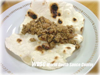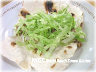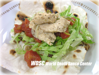 【ラストトッピング、チキン・ファヒータを乗せていただきます〜!】 ■既に一番最初にチリビーンズを乗せていますし、肉がない訳ではありませんからチキン・ファヒータをこれでもか!と乗せる必要はありません。こんな感じで軽めに乗せておけば、十二分に美味しいです。やっと完成しました!とっとと丸めて頂きましょう。こうした料理は食べる時は丸かじりですし、どうしても上品には頂けません。(トッピングを乗せすぎた時なんかは、食べている方と逆側からボタボタトッピングが溢れて落ちたりしますし・・)そこは割り切ってみんなで楽しくタコスタイムを過ごしましょう。今回使った「デラウェア・デストロイヤー・サルサ」は口に入れた瞬間から激辛!という極悪非道なものではなく、一口目、二口目・・・「ん、確かにちょっと辛目のサルサかな」三口目、四口目・・・「ん・・?これ最初わからなかったけど、結構辛いね!」五口目、六口目〜その辛さが続く、といった感じでしょうか。ちなみにこの量で、当方は3本頂いて満腹でした。満腹ですが、トッピング内容を見るとかなりヘルシーなんです。大食いの方がモリモリ食べても大丈夫! |