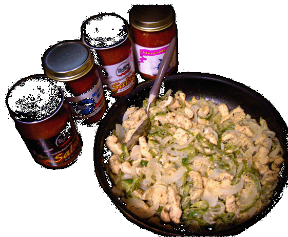 【サルサ4種類とチキン・ファヒータ記念写真】 ■チキン・ファヒータができた時点で、「あーもうこれだけ頂いて終わりにしようかな」という誘惑に負けそうになりました。クミンなどの香辛料の香りが部屋に充満して食欲を異様に刺激してきます。並んでいるサルサは左から「ブレアーズ・サルサ・XXXホット」「デラウェア・デストロイヤー・サルサ」「ブレアーズ・サルサ・ミディアムホット」「チェサピーク・チャレンジ・サルサ」です。一応撮影ということで、少しでも日常感をなくせばと思いまして、スプーンはイタリアのラゴスティーナのものを使ってみました。次は肝心のサルサ、どれを使うかが問題です・・・。 |
